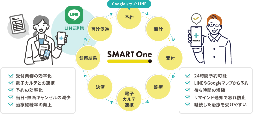Google検索からの予約導線やLINE連携、電子カルテ連携まであらゆる業務を自動化します。