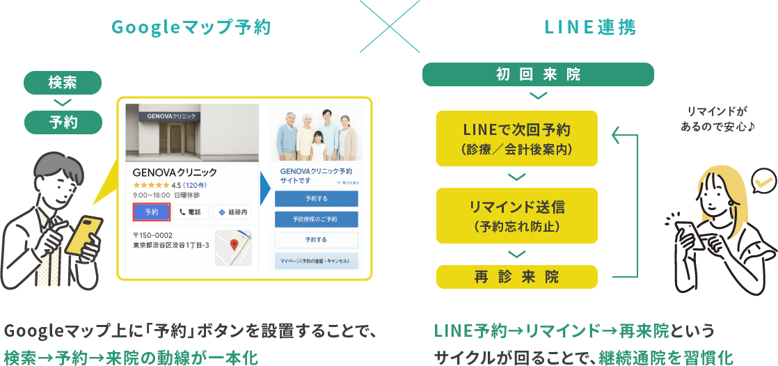 仕組みで「集患力UP」 - Googleマップや検索結果から直接予約できる導線を整備し、患者はワンクリックでクリニックの予約画面へ。LINE連携で予約の取りこぼしを防ぎ、広告費を抑えながら新患獲得につなげます。