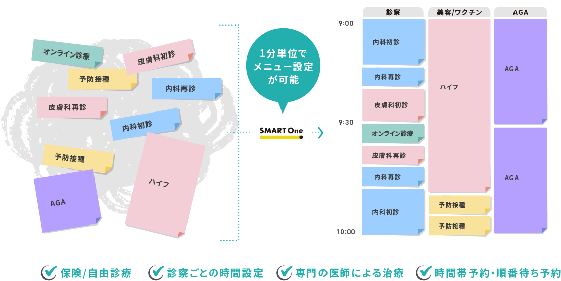 1分単位での枠設定や、診療科・施術・ワクチンなど多様なメニューに対応。